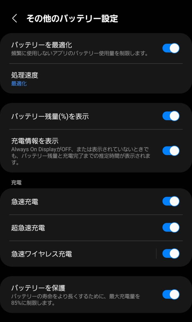 設定アプリを開き、 [バッテリーとデバイスケア] → [バッテリー] → [その他のバッテリー設定] → [バッテリーを保護]をオンに変更。