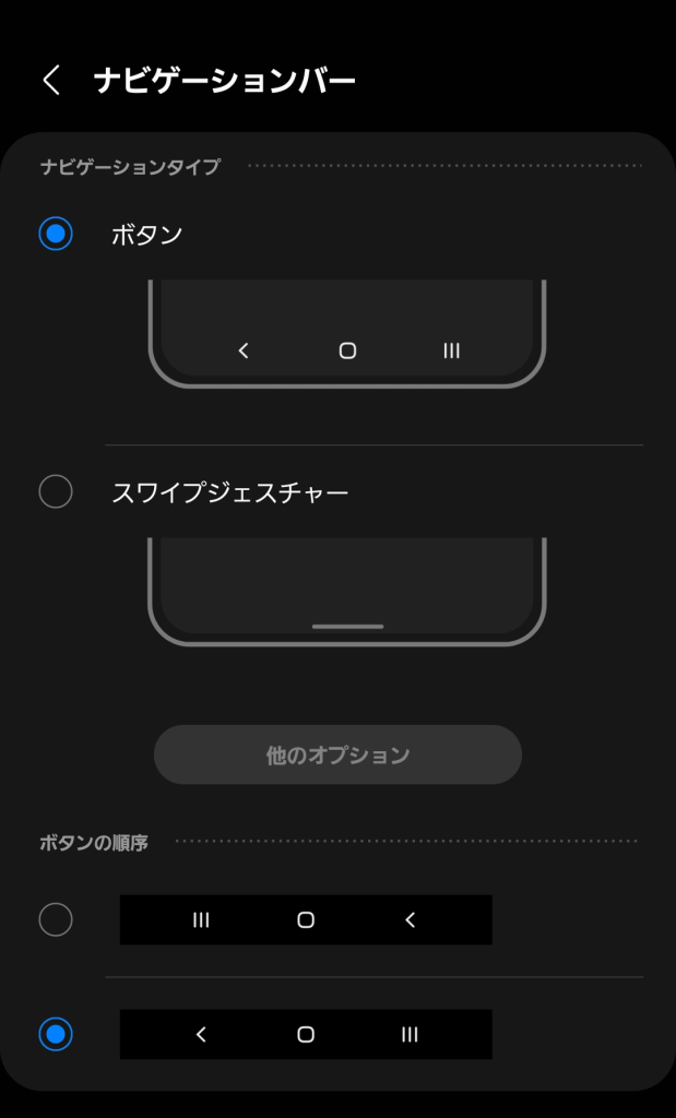 Galaxyは昔から戻るが右側にあるのが特徴だと思うが、他社端末をしばらく使っていた身からすると戻るボタンは左にないと落ち着かないので設定を変更。
