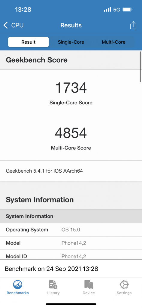 ベンチマークに使用したのはGeekBench 5.4.1。どちらも充電器から外して実行した。