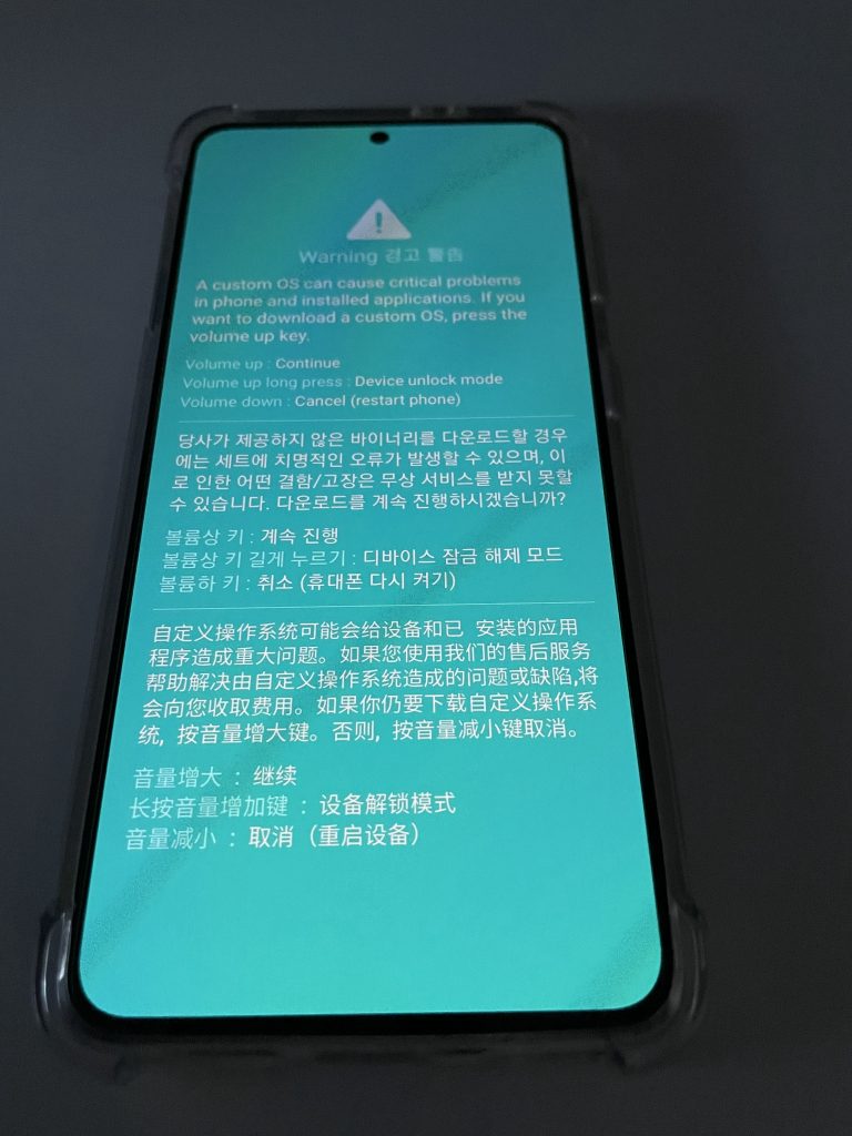 そのまま3つのボタンを押し続けたままにすると上記画面になり、音量+ボタンを押すことでダウンロードモードに入ることができる。