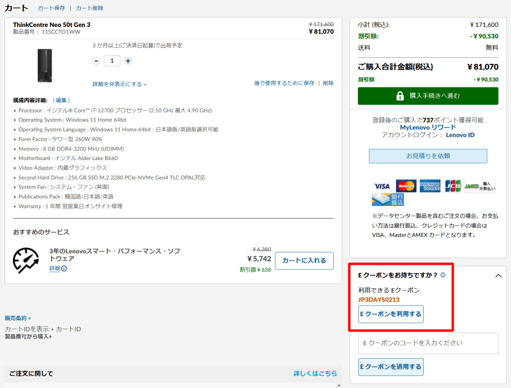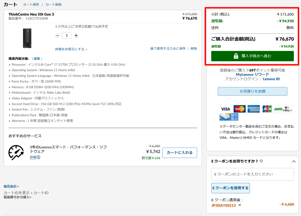 Eクーポンが適用されると、最安構成であれば以下画像のように76,670円になっているはずだ。