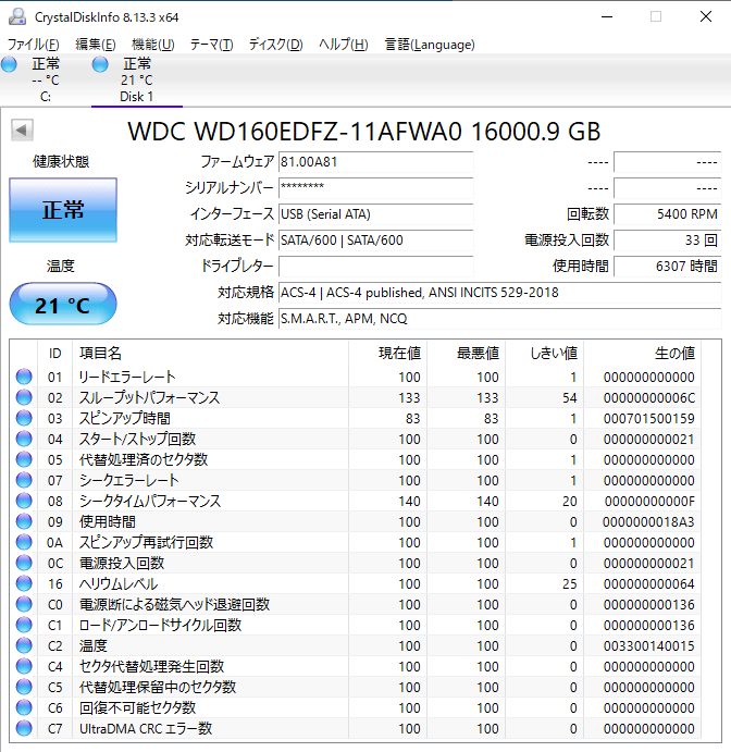 なお、WD160EDFZの方はNASで使っているHDDなので使用時間が6,307時間になっている。